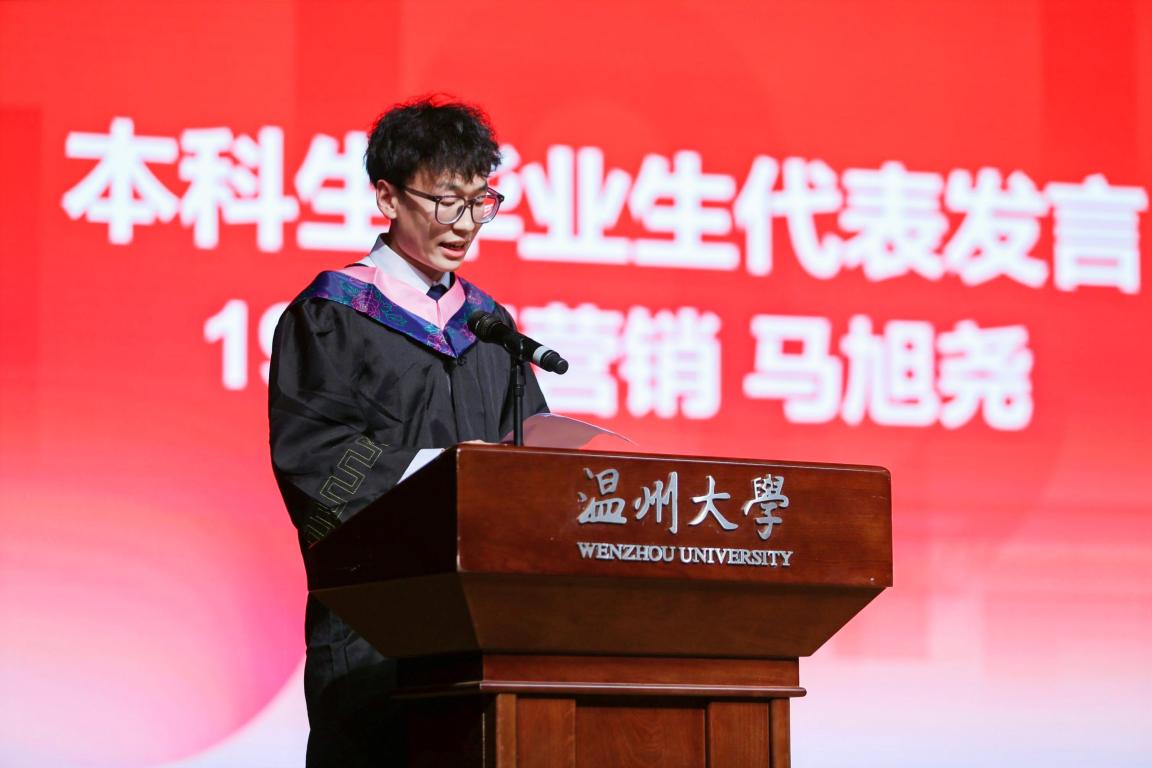 原团委学生会主席、19市销班马旭尧同学作为本科生毕业生代表发言,他回顾了当年报考成人视频