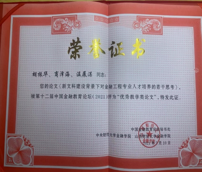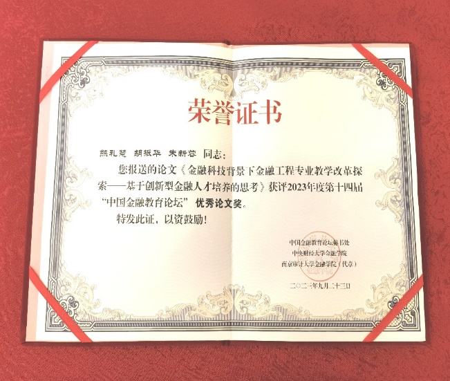 熊礼慧提交的论文《金融科技背景下金融工程专业教学改革探索——基于创新型人才培养的思考》入选并获优秀论文奖。这是我院获得继第十二届论坛优秀论文后,再一次获评的优秀论文。