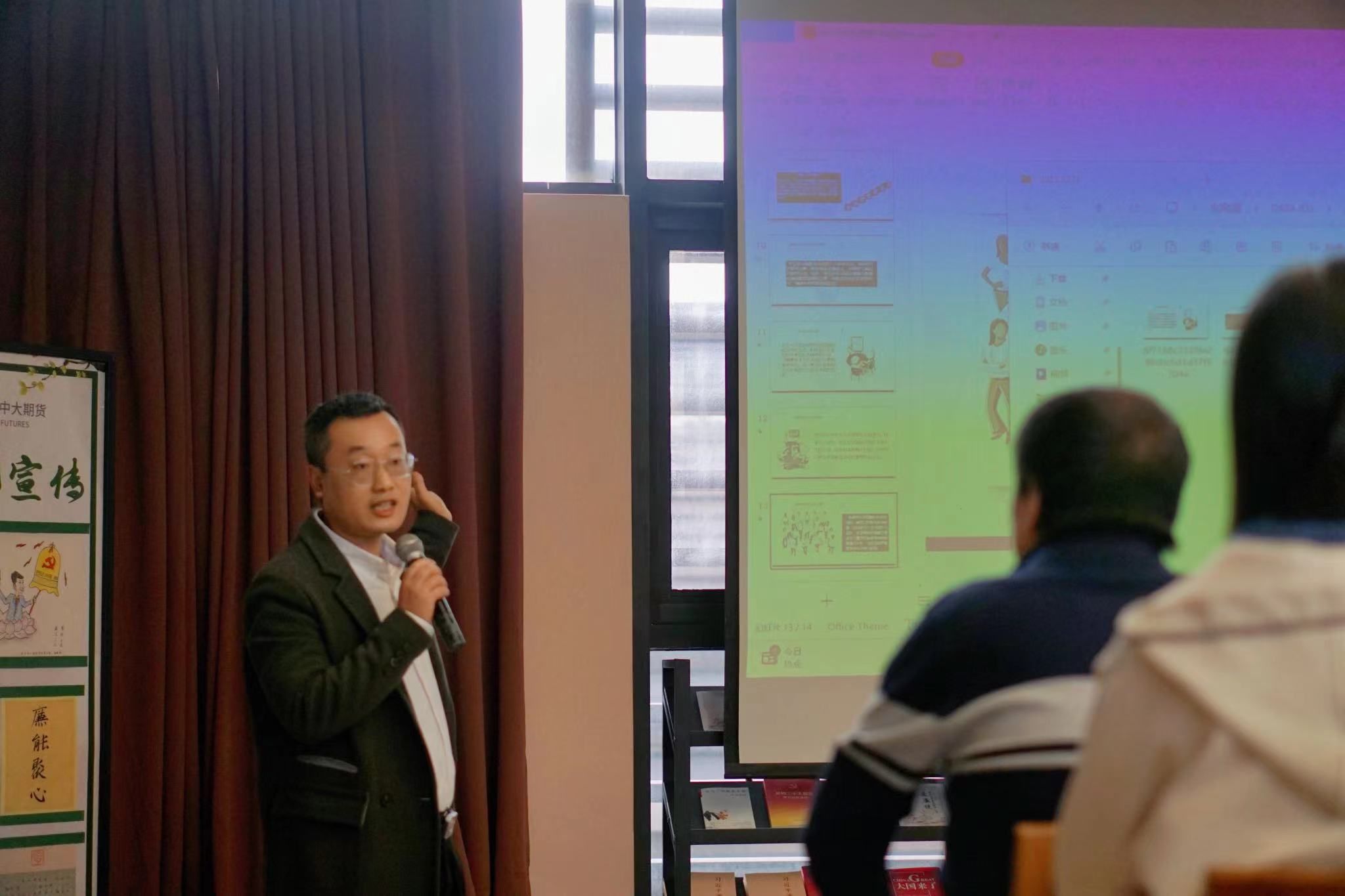 在看完宣传片之后,陈孝雨总经理为同学们讲述了他在期货行业工作的个人经理和温州营业部的发展。他于1998年毕业于浙江财经大学的证券专业,拥有五年证券行业的经验和十五年的期货行业的经验,是一名资深的金融从业者。他介绍了期货交易“一体两翼”。其中“一体”是指以经纪业务为基础,它确保了公司的稳定运营和收入来源。而“两翼”则分别指风险管理业务和财富管理业务,这两部分作为公司业务的拓展和发展引擎,助力公司实现多元化发展和收入增长。他表示,近年来由于温州的经济环境下滑,非常需要新兴人才重振雄风,希望能利用好金融作为工具为事业服务。他强调,随着中国经济的持续发展,期货市场将在国民经济中发挥越来越重要的作用。他鼓励学生们要努力学习金融知识,学习过程中要注意实践,提高自己的综合素质,为将来投身期货、证券市场做好充分准备。