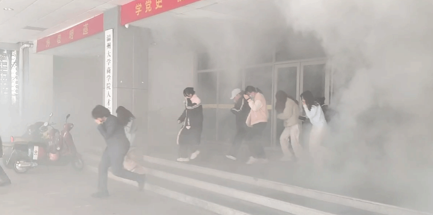 随着演练警报声的响起,楼道内预设起火点浓烟滚滚,在保卫处老师的指引下,学生捂住口鼻,降低身姿,沿着预定的疏散路线,快速有序地撤离至安全地带,站队、清点人数、汇报情况。整个疏散过程配合默契,疏散路线清晰,组织有条不紊,人人各尽其责,达到了“迅速、安全、有序”的演练目标。