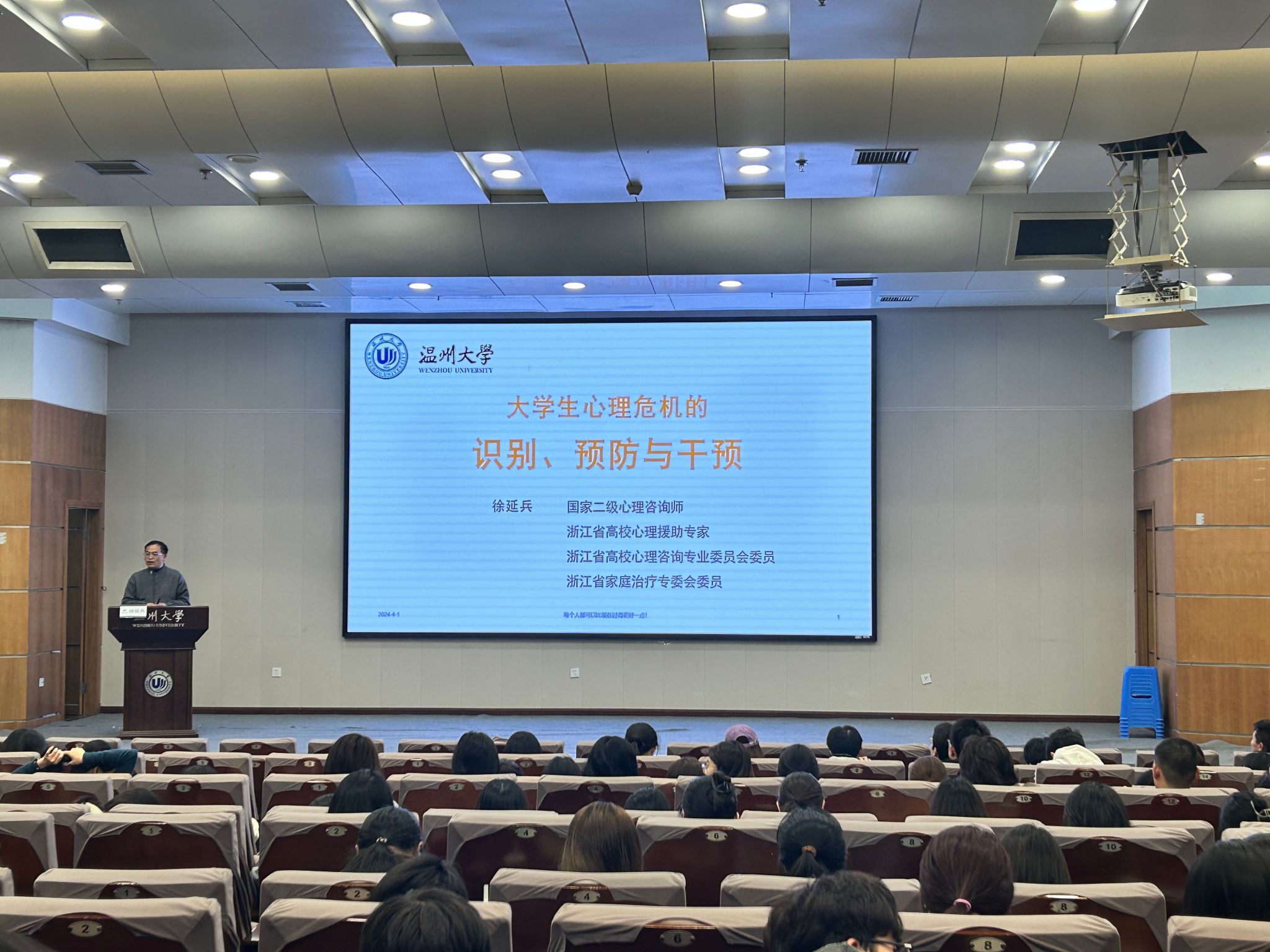 随后,校心理健康中心徐延兵老师分享了大学生心理危机的识别、预防与干预专题讲座。徐老师结合自身工作经历,从什么是心理健康、如何发现心理健康危机、如何介入心理健康危机等三方面展开,着重强调大学生要增强对心理健康的认识,在竞争压力日益增加的今天,同学们更要正视焦虑、抑郁等心理健康问题,正确看待大学恋爱、生活以及实习当中所承受的压力,学会依据自己的真实心理状况排解负面情绪或者寻求帮助,维护自己的心理健康,积极快乐投入到大学的学习与生活之中,老师同时还建议各级班委积极了解同学们的心理健康状况,发现异常时及时向负责的老师进行汇报。