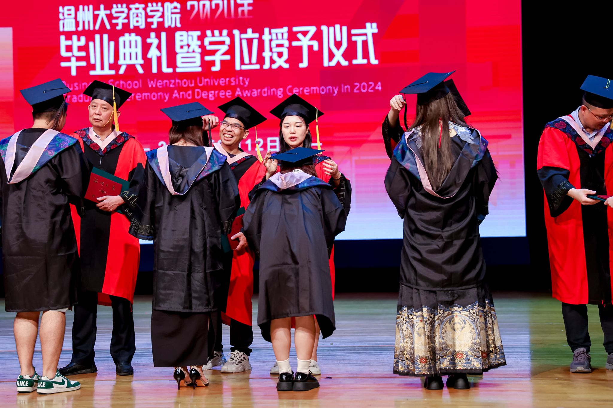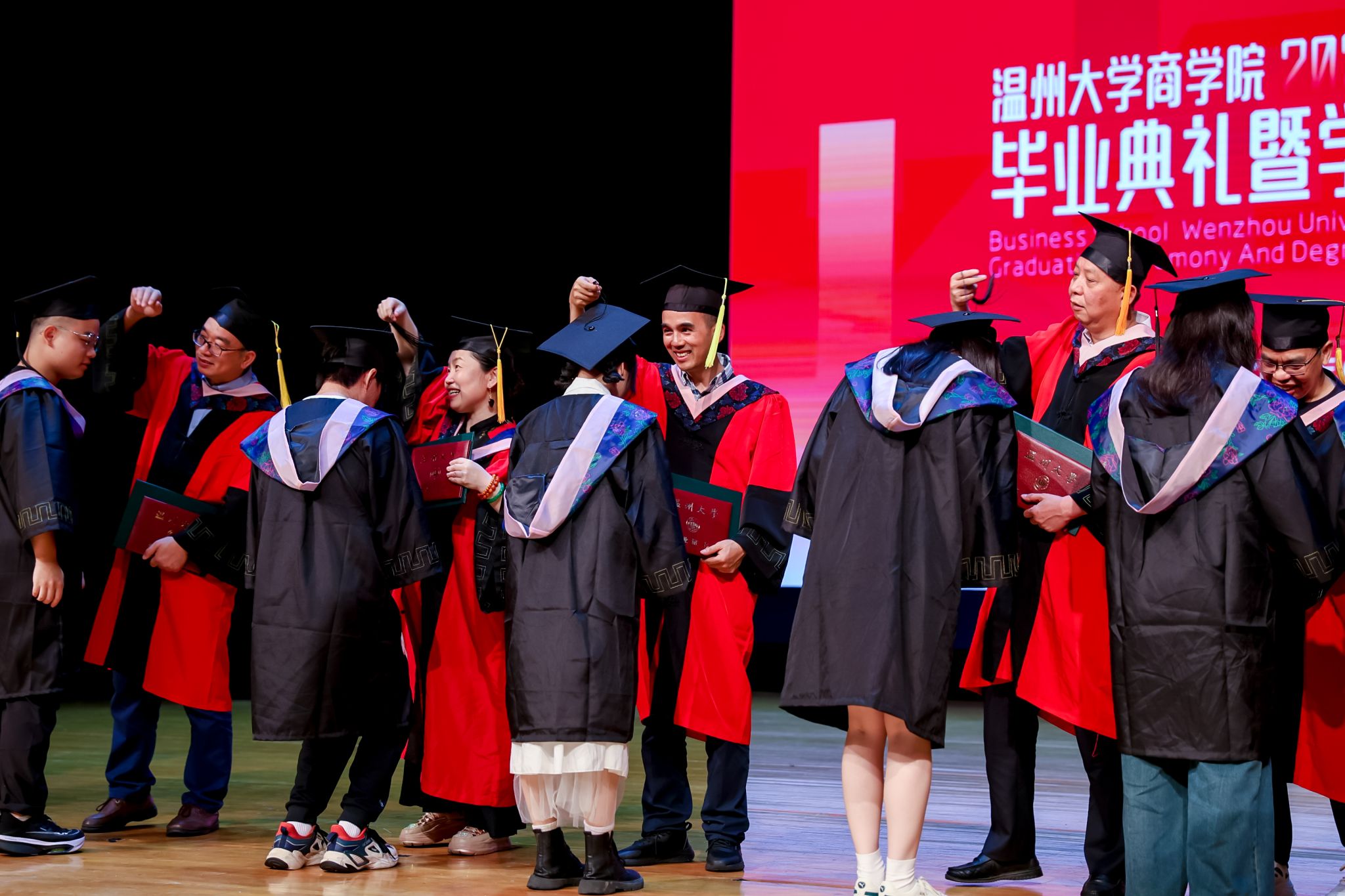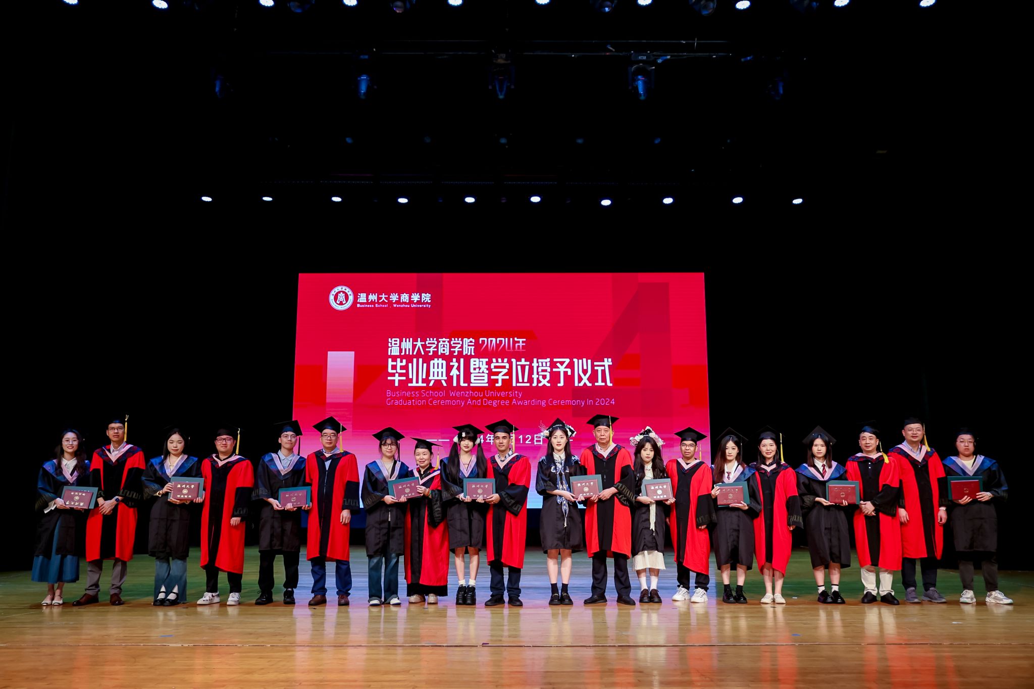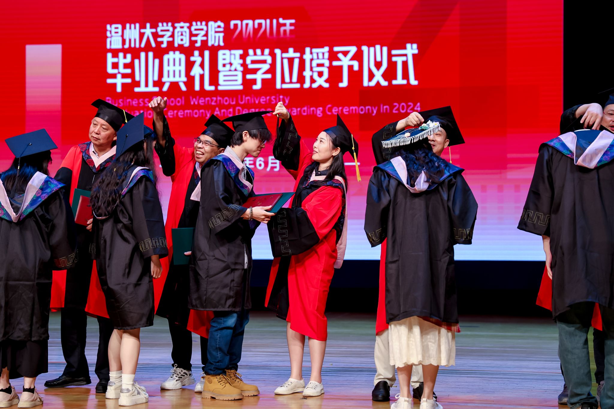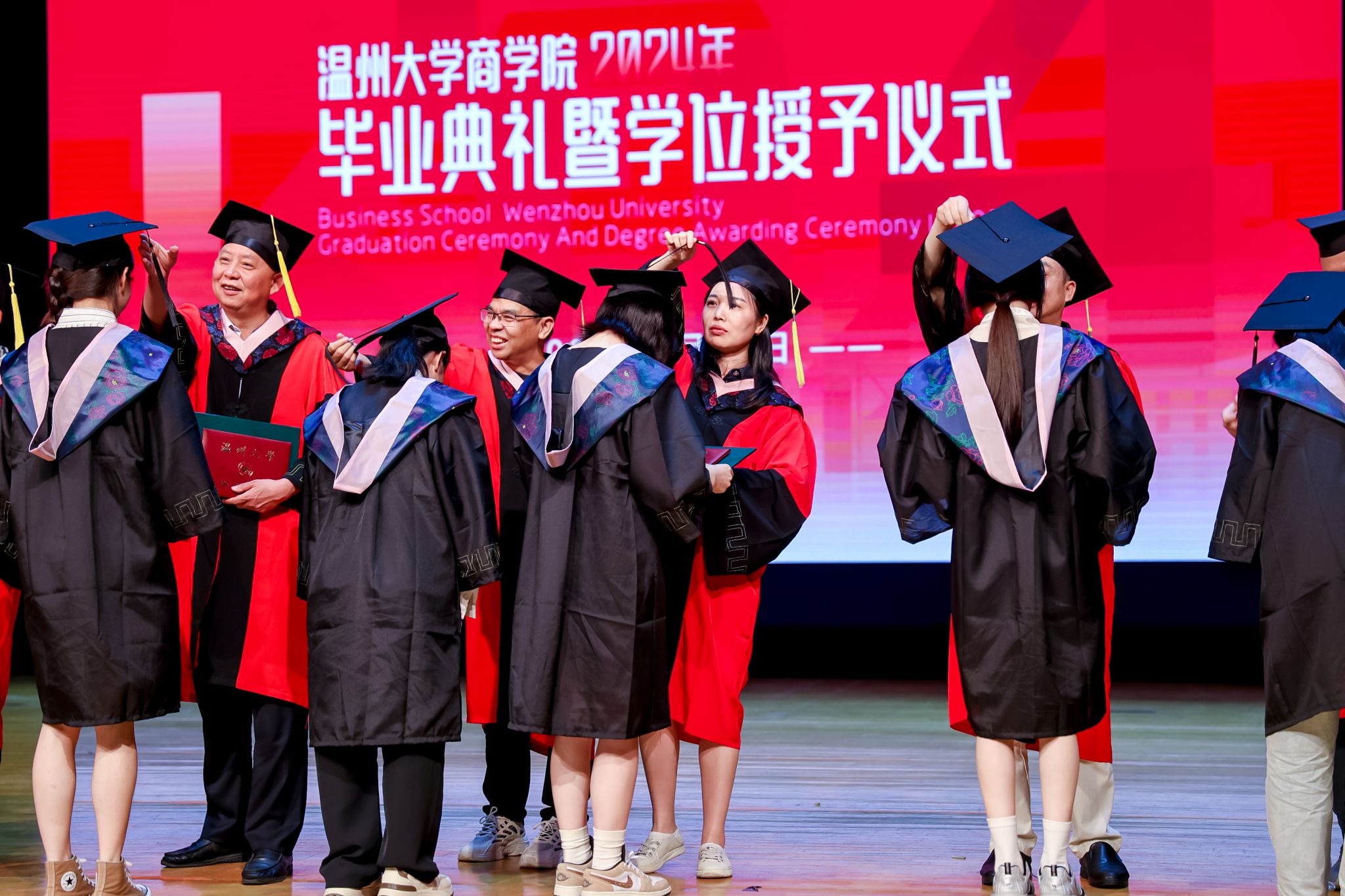 学术委员会的教授代表们依次走上台前,为每一位毕业生庄重地拨穗,亲手颁发毕业证书和学位证书,随后与毕业生们共同合影留念,以记录下这人生中意义非凡的时刻。