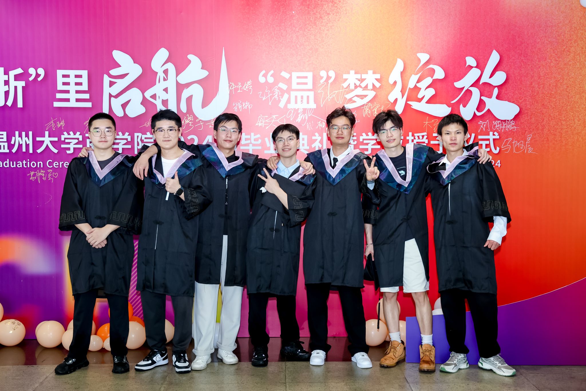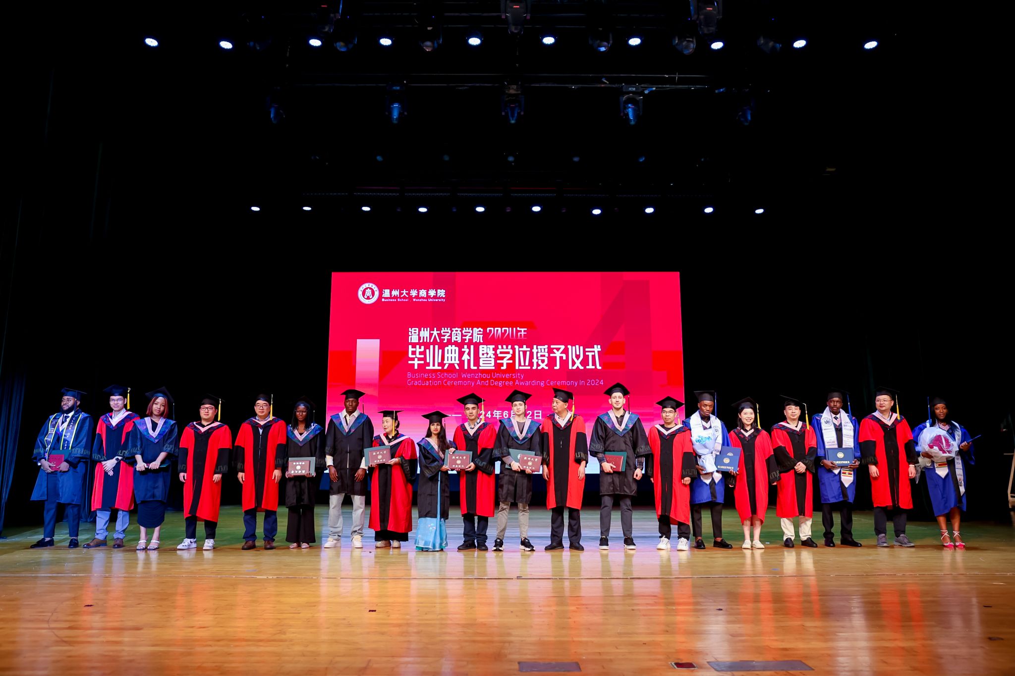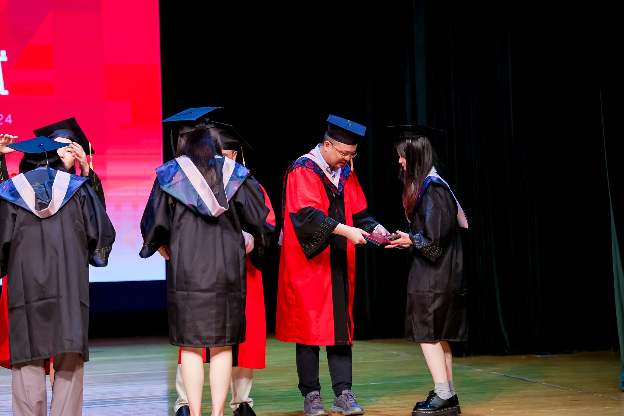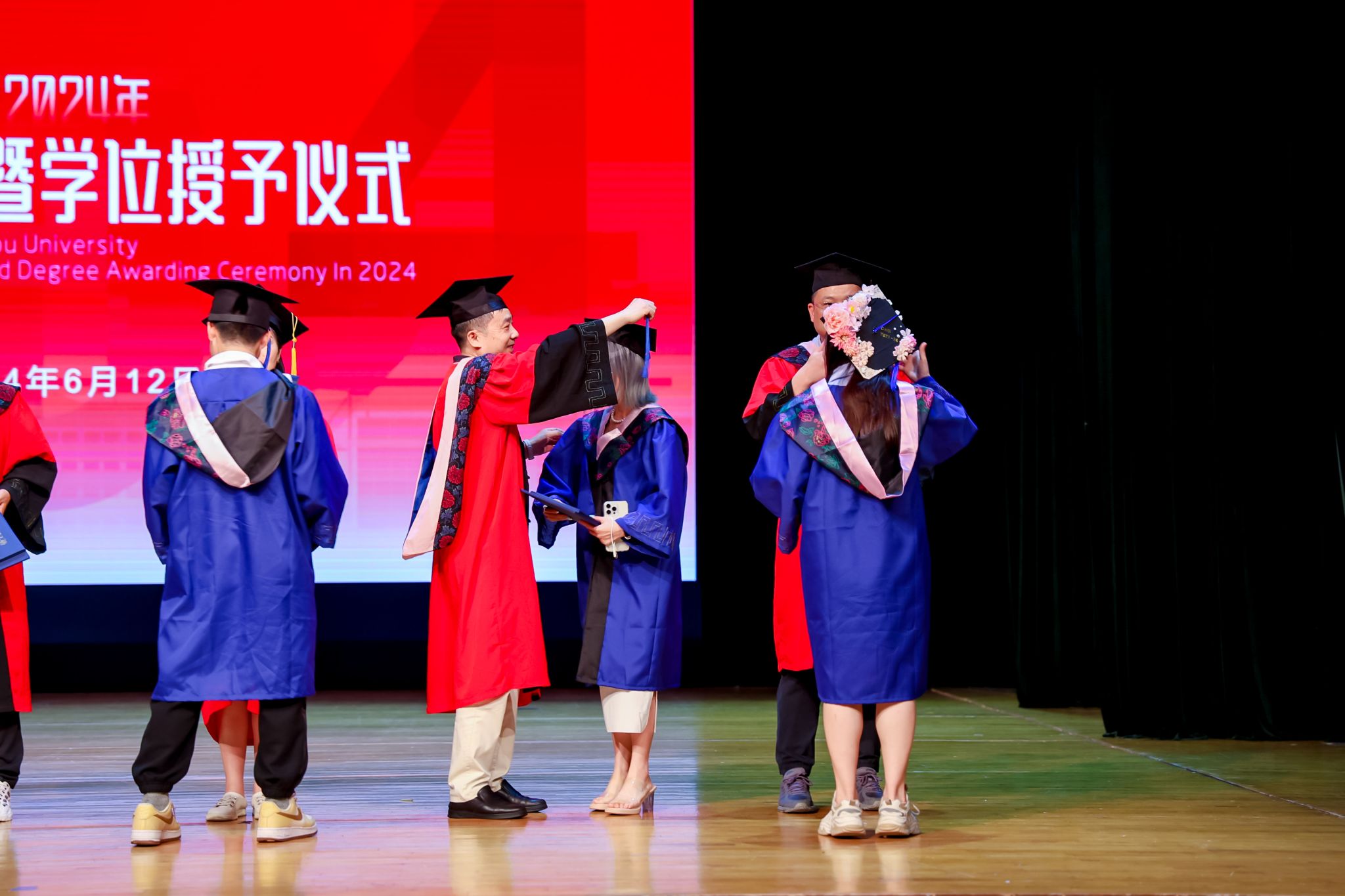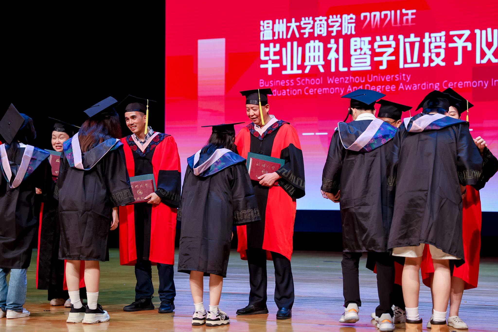 学术委员会的教授代表们依次走上台前,为每一位毕业生庄重地拨穗,亲手颁发毕业证书和学位证书,随后与毕业生们共同合影留念,以记录下这人生中意义非凡的时刻。