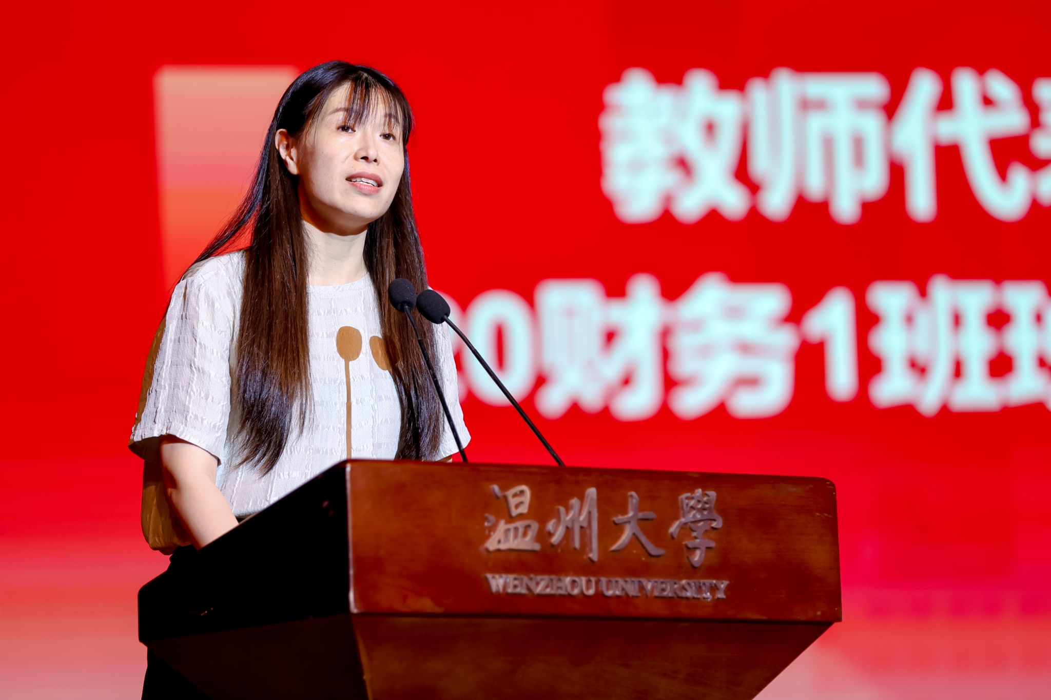 20财务管理1班班主任王钰老师作为教师代表发言,她首先代表所有班主任向毕业生们表达了热烈的祝贺,并对辛勤付出的教师们表达了崇高的敬意。王钰老师深情地回顾了学生们四年的学习生活,从最初接触看似艰涩难懂的经济定理,到沉浸在生动的管理案例学习之中,再到深刻感悟中国百年复兴的艰辛与辉煌,这些经历都化作了学生们心中宝贵的财富。她引用“得其大者可以兼其小”的古语,鼓励学生们把人生理想融入国家和民族的事业中,持续学习,知行合一,勇担新时代青年人的责任与使命,为祖国的发展贡献自己的力量。同时,她又以“积水成渊,蛟龙生焉”为喻,祝愿同学们在未来的日子里,能够如鱼得水,入海为龙。