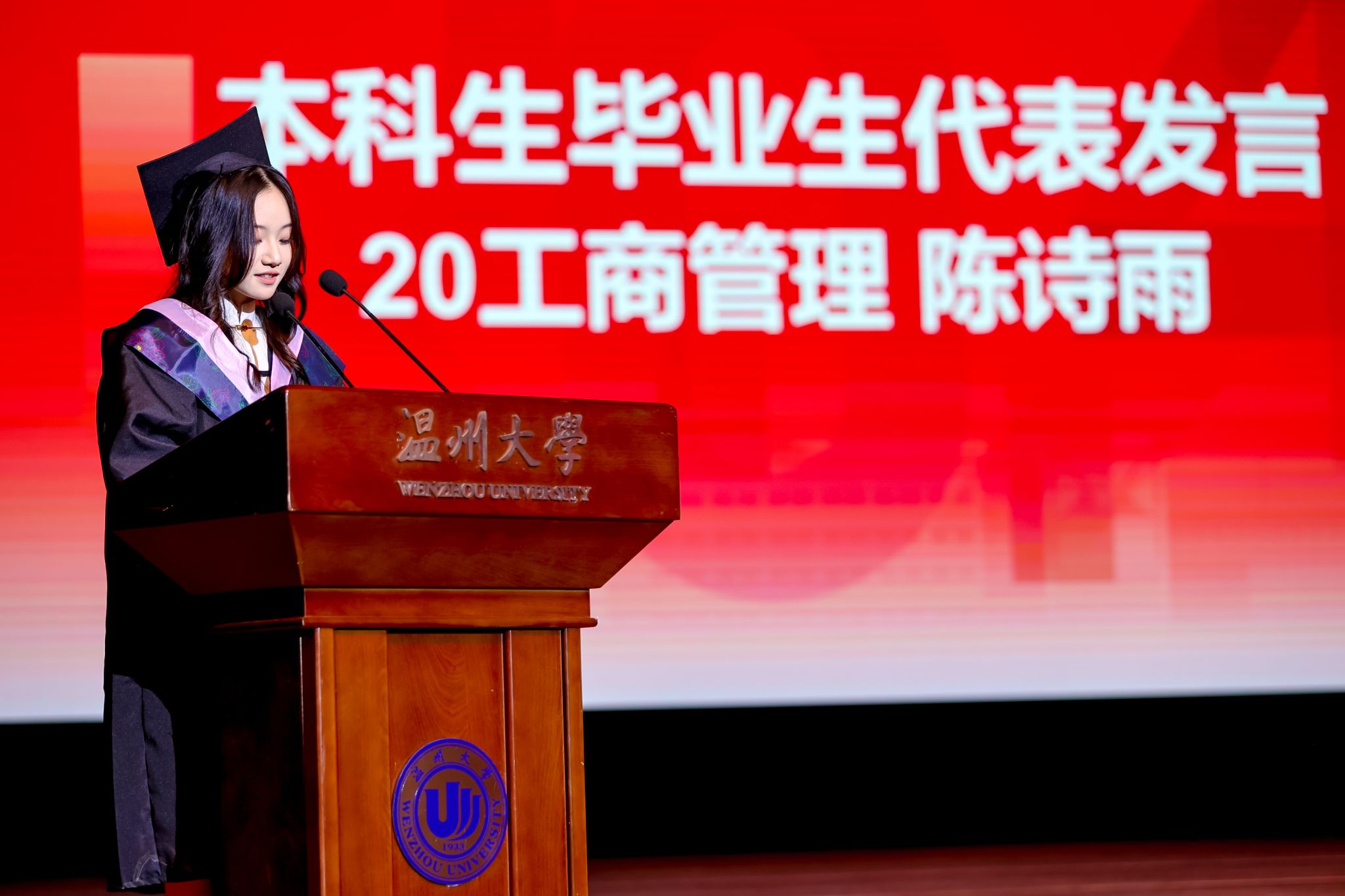 20工商管理班陈诗雨同学作为本科生毕业生代表发言,她首先感谢母校、师长与亲友的陪伴与教诲,将大学四年的成长与奋斗描绘得如诗如画。从图书馆深夜的盏盏灯火到操场上的滴滴汗水,从求职的焦虑迷茫到梦想的奋力追逐,每一步都凝聚着青春的力量。毕业之际,她以房琪的寄语为引,鼓励大家勇敢面对未来的挑战,珍惜每一次出发的勇气,即使前路未知,也要心怀希望,保持少年的热血与梦想。最后,她以深情的告别,祝愿大家阅尽千帆,归来仍是少年。